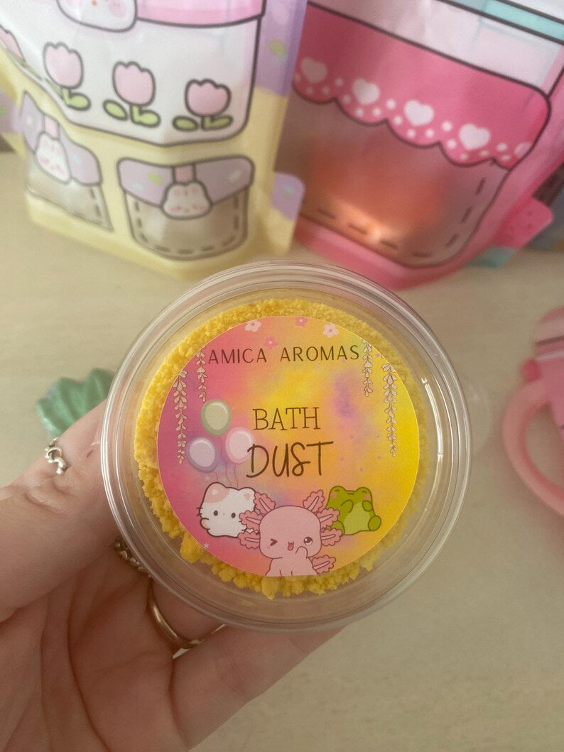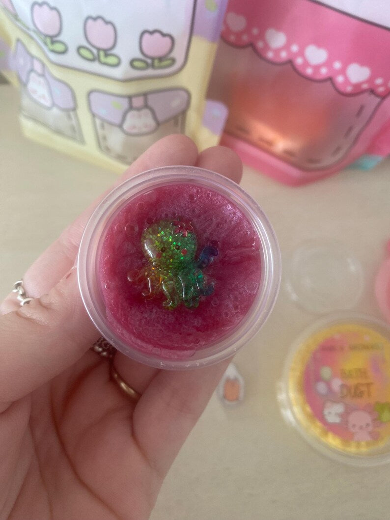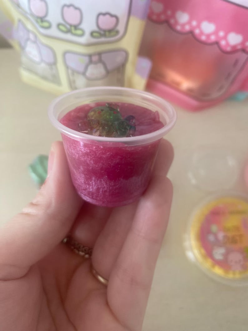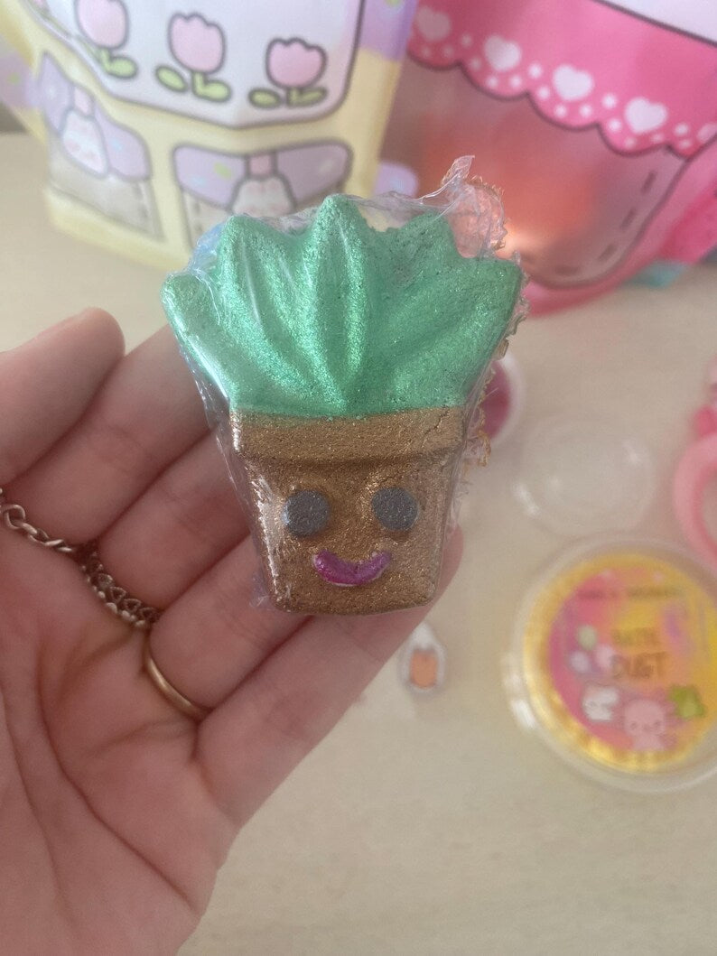 Each bath bag contains a kawaii style bath bomb, jelly soap, pot of bath dust a gum ball figure and stickers. Contents and bag colours will vary.